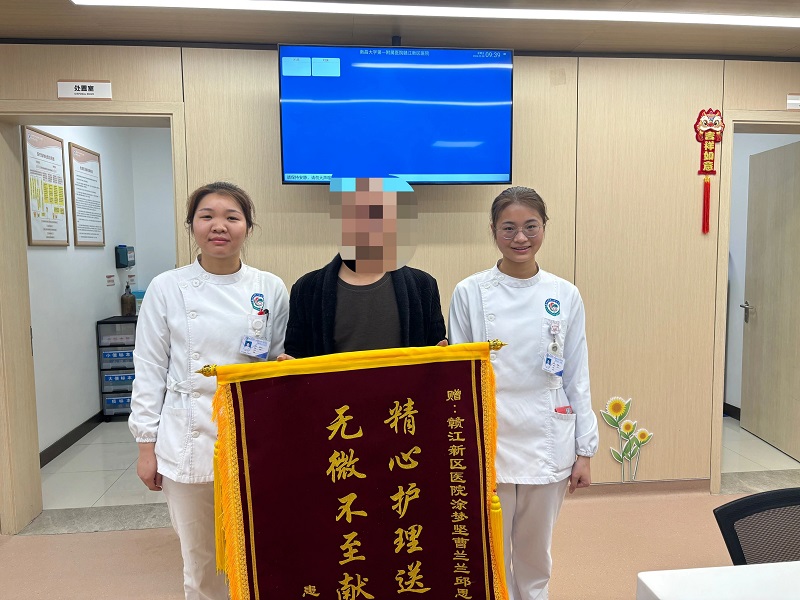 3月8日上午,南昌大学第一附属医院赣江新区医院(赣江新区人民医院)综合外科护士站上演了温馨的一幕,患者涂先生将一面写有“精心护理献爱心,无微不至送温暖”的锦旗送到综合外科,表达对综合外科全体护士的感谢之情。