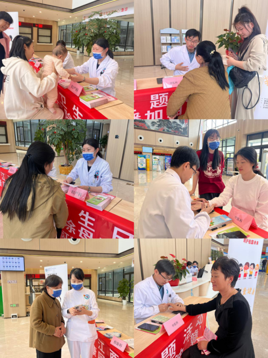 活动现场,感染控制科(公共卫生科)联合妇产科、儿科、中医科、预防接种门诊、检验科医护人员,通过科普讲解,健康咨询等方式向患者宣传生育政策、基本公共卫生知识、健康生活方式、常用避孕药具使用方法、儿童疫苗接种等内容。他们讲解了如何预防梅毒、艾滋病、乙肝等相关传染疾病,养成良好的生活习惯,提倡大家适当锻炼、合理膳食、保持健康向上的积极心态。