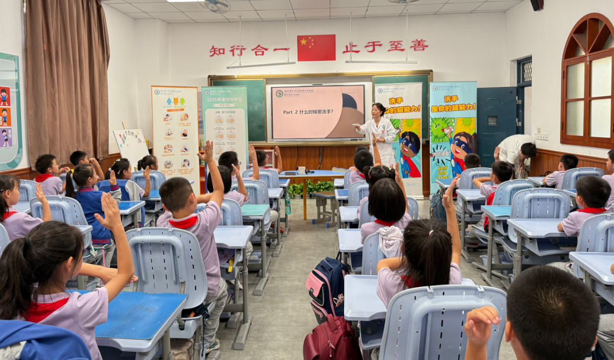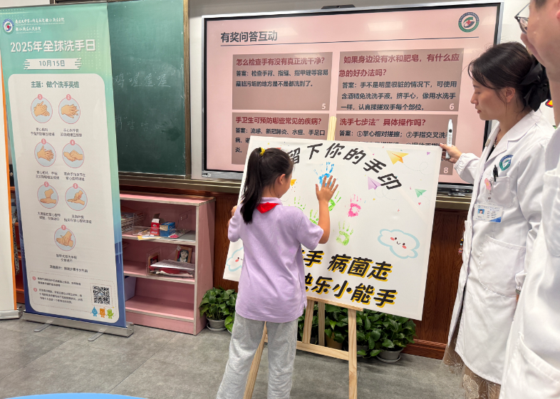 在强化内部感控建设的同时,赣江新区医院也积极承担社会责任,将手卫生的科普课堂带进了校园。10月16日,医院感控团队来到雷式小学。在充满童趣的“手印签到画板”中开始,孩子们用沾满环保颜料的小手,在画板上印下一个个五彩的手印,共同绘制成一幅象征健康与希望的集体艺术作品。
